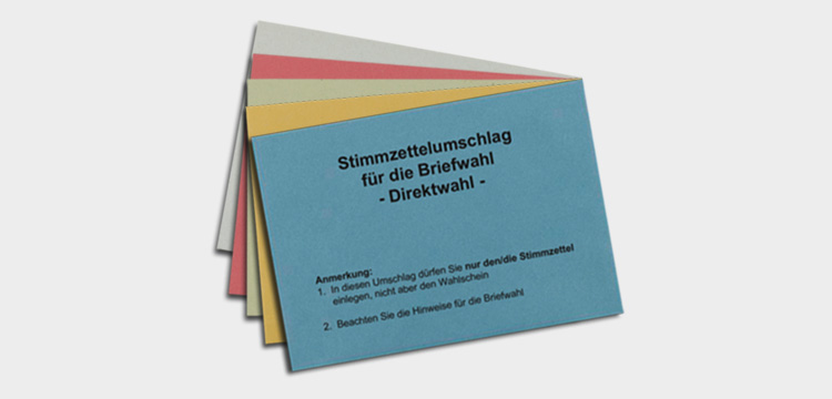 Wahlbriefumschläge, Stimmzettel und Merkblätter erhalten Sie von uns fertig bedruckt. Wir haben uns auf die Anfertigung von Briefwahlunterlagen spezialisiert und achten auf die Einhaltung der erforderlichen Standards, damit einem reibungslosen Wahlvorgang nichts im Wege steht. Ein abriebfester Aufdruck ist dafür genauso wichtig wie ein deutlicher Kontrast der Aufschrift zur Papierfarbe. Informationen auf den Wahlumschlägen oder beiliegenden Merkblättern sollen die wählende Person anleiten und zu einer korrekten Stimmabgabe beitragen. Gerne können Sie hierfür auf unsere vorgefertigten Muster zurückgreifen. Natürlich fertigen wir Briefwahlunterlagen auch individuell für Sie an und bedrucken sie nach Ihren Wünschen.